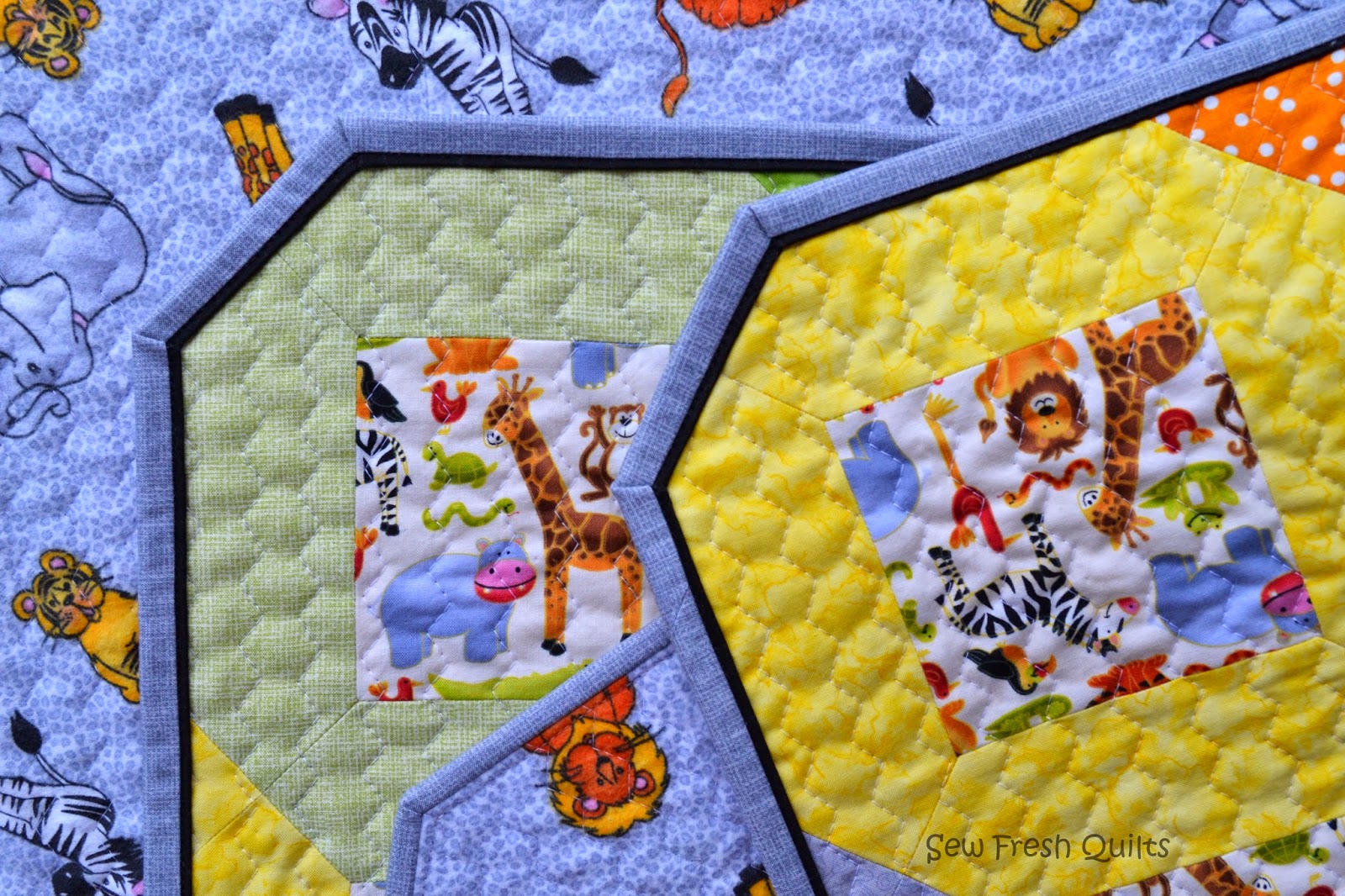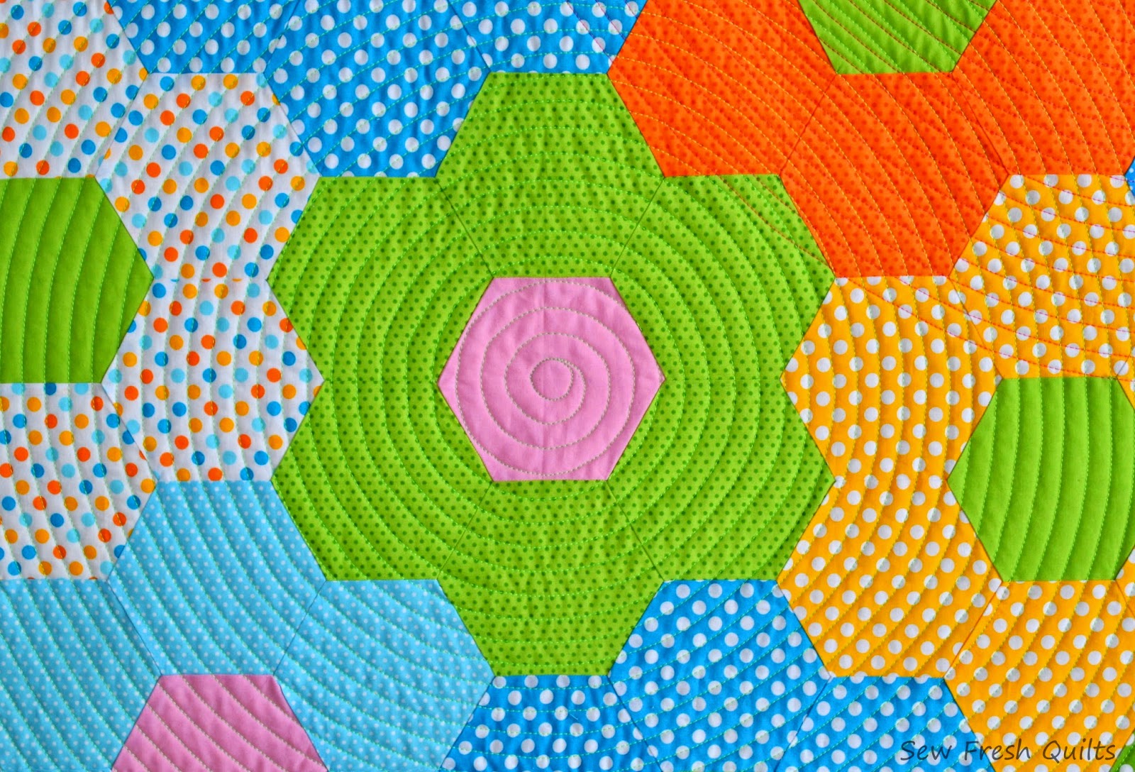 Also referred to as Honeycomb Quilting, I first discovered this quilting method courtesy of Amanda Jean of Crazy Mom Quilts here. My only caution in using this method is that it can cause quite a bit of shifting. In spite of heavily pinning during the basting stage, my quilt top on Flowers in the Sun continued to shift to the right as I quilted each line. It was a close one, so I encourage you to be generous in the dimensions of your backing if using this stitch to finish your quilt. And baste heavily!