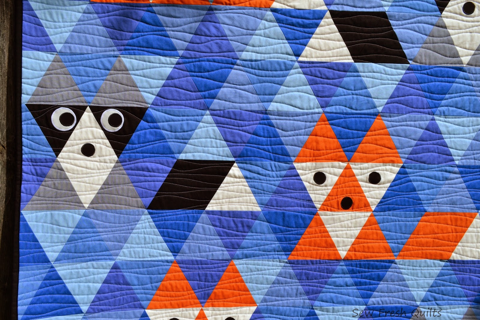 Fox & Friends2 was another first for me - using a minky backing. On this quilt I kept the lines closer together. My only real concern were those applique eyes and noses. I did not want to quilt on top of them. So I quilted around them. I think the exaggerated curves only serve to enhance the raccoons' masks.